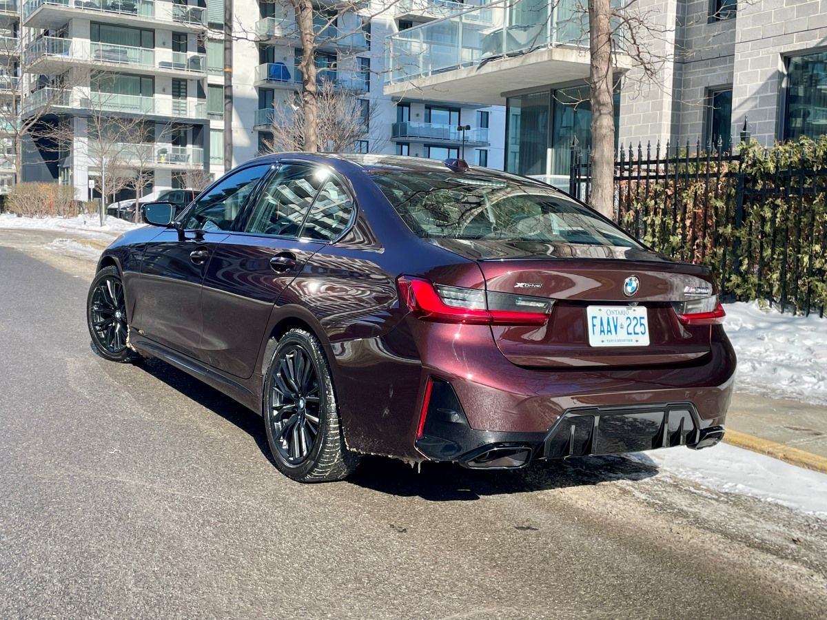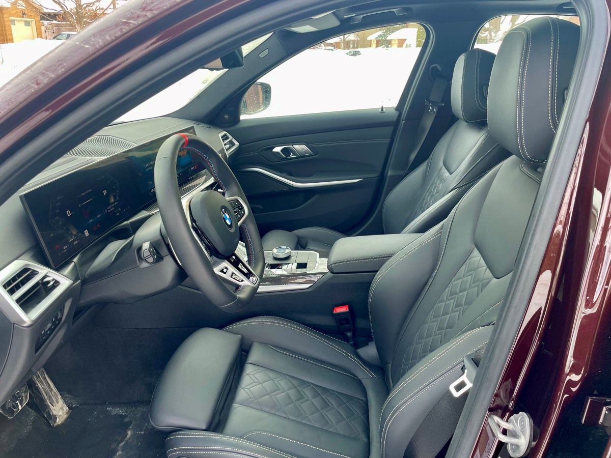 L’Édition 50 Jahre propose six couleurs métallisées BMW Individual inspirées des générations emblématiques de la Série 3 : Rouge Madère (couleur de notre véhicule), Vert Laguna, Bleu Avus, Noir Carbone, Vert Profond et Noir Citrin. Chacune est associée à une sellerie en cuir Extended Merino spécifique et à des étriers de frein colorés distinctifs. Des badges “50 Jahre Edition”, des seuils de portes exclusifs, un aileron arrière en fibre de carbone, un échappement M Performance et des jantes forgées M de 20 pouces complètent l’ensemble. Le résultat demeure élégant, musclé et fidèle à l’ADN BMW. À noter que notre essai hivernal a pour conséquence que le véhicule avait échangé les superbes jantes de 20 pouces pour des montures de 18 pouces beaucoup moins distinctives.
