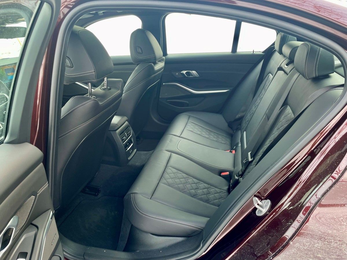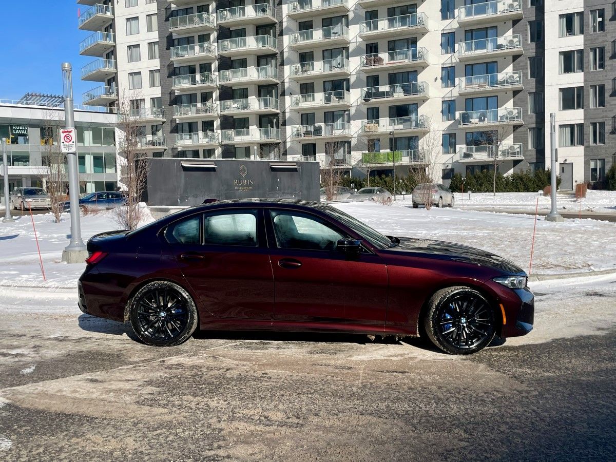 L’Édition 50 Jahre propose six couleurs métallisées BMW Individual inspirées des générations emblématiques de la Série 3 : Rouge Madère (couleur de notre véhicule), Vert Laguna, Bleu Avus, Noir Carbone, Vert Profond et Noir Citrin. Chacune est associée à une sellerie en cuir Extended Merino spécifique et à des étriers de frein colorés distinctifs. Des badges “50 Jahre Edition”, des seuils de portes exclusifs, un aileron arrière en fibre de carbone, un échappement M Performance et des jantes forgées M de 20 pouces complètent l’ensemble. Le résultat demeure élégant, musclé et fidèle à l’ADN BMW. À noter que notre essai hivernal a pour conséquence que le véhicule avait échangé les superbes jantes de 20 pouces pour des montures de 18 pouces beaucoup moins distinctives.