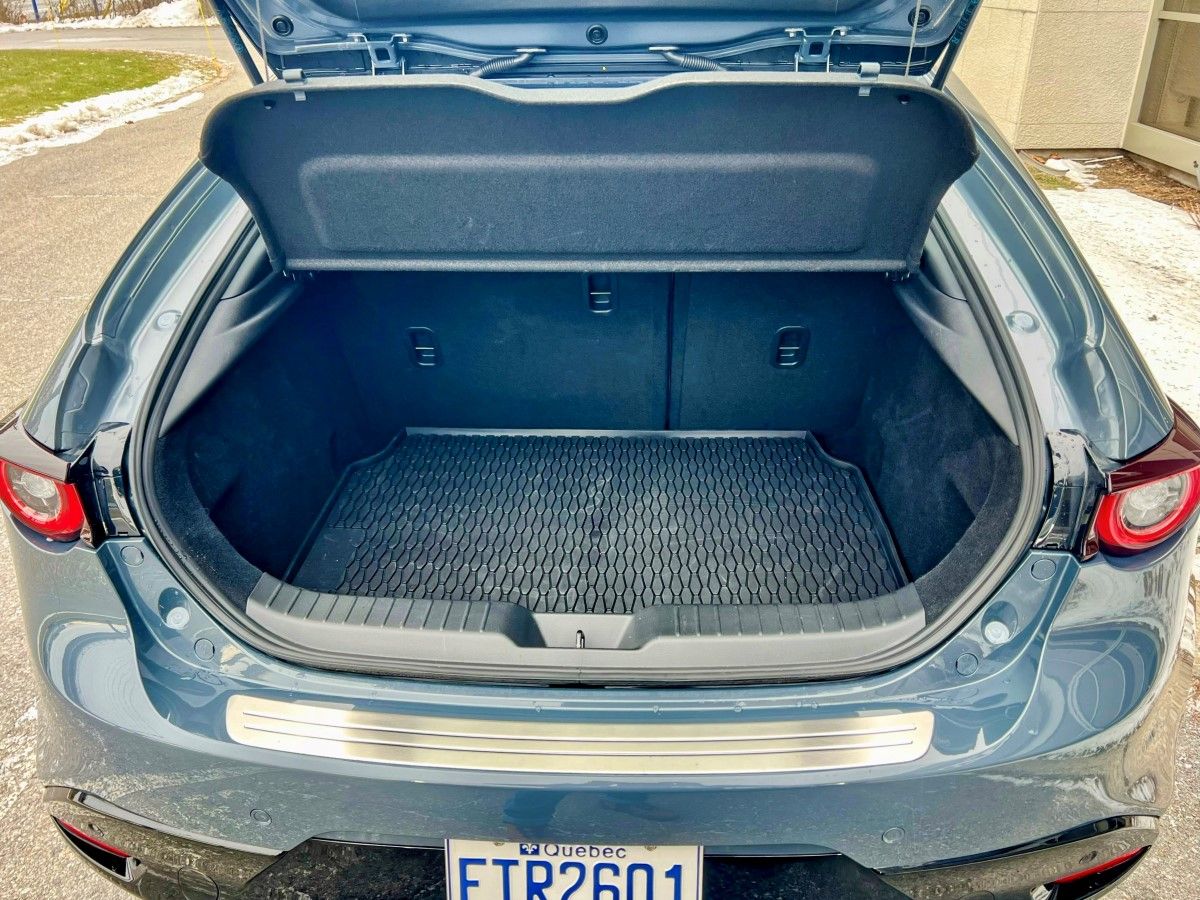À bord, cette compacte se distingue immédiatement par son ambiance haut de gamme. Mazda continue de démontrer qu’il est possible d’offrir une expérience quasi premium dans une compacte accessible. Les matériaux sont soigneusement choisis, l’assemblage est précis et la présentation générale est sobre, élégante et orientée vers le conducteur. Bref, c’est simple et joli aux yeux des occupants. La version GT propose un équipement généreux incluant un écran central plus grand, un système audio haut de gamme et des sièges au maintien latéral accentué. L’ergonomie privilégie les commandes physiques et la molette centrale, ce qui réduit la distraction au volant, même si certains conducteurs préféreront un écran tactile plus traditionnel.