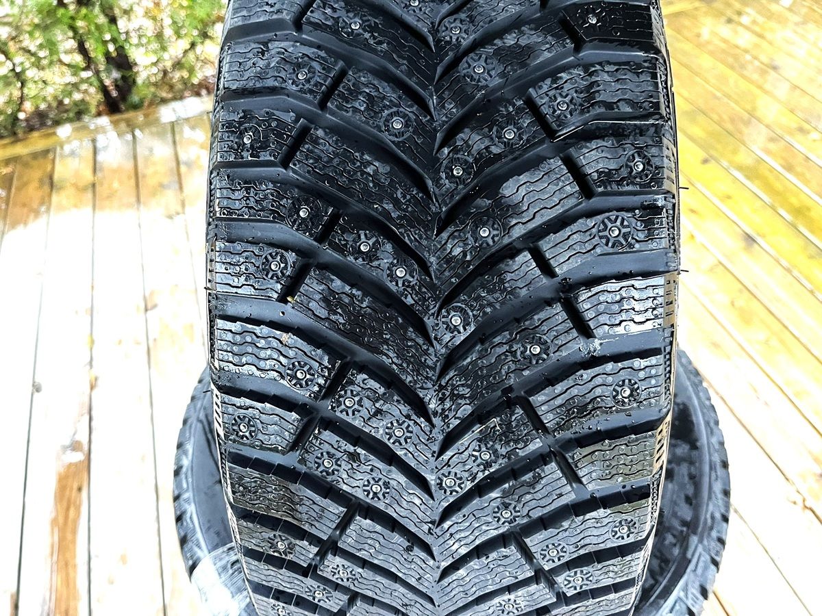 Le Michelin X-Ice North 4 est un pneu d’hiver clouté en usine, doté d’une conception optimisée pour les surfaces glacées. Il intègre jusqu’à 250 clous disposés selon un algorithme spécifique afin de maximiser l’adhérence tout en réduisant le bruit. Sa bande de roulement présente un dessin en V avec des rainures larges pour faciliter l’évacuation de la neige, de l’eau et de la gadoue. Les lamelles 3D imbriquées améliorent la stabilité et le mordant dans les virages. Le composé de gomme est formulé pour rester flexible à très basse température, tout en conservant sa rigidité à des températures modérées. Michelin annonce également une réduction des vibrations et un confort supérieur par rapport aux générations précédentes.